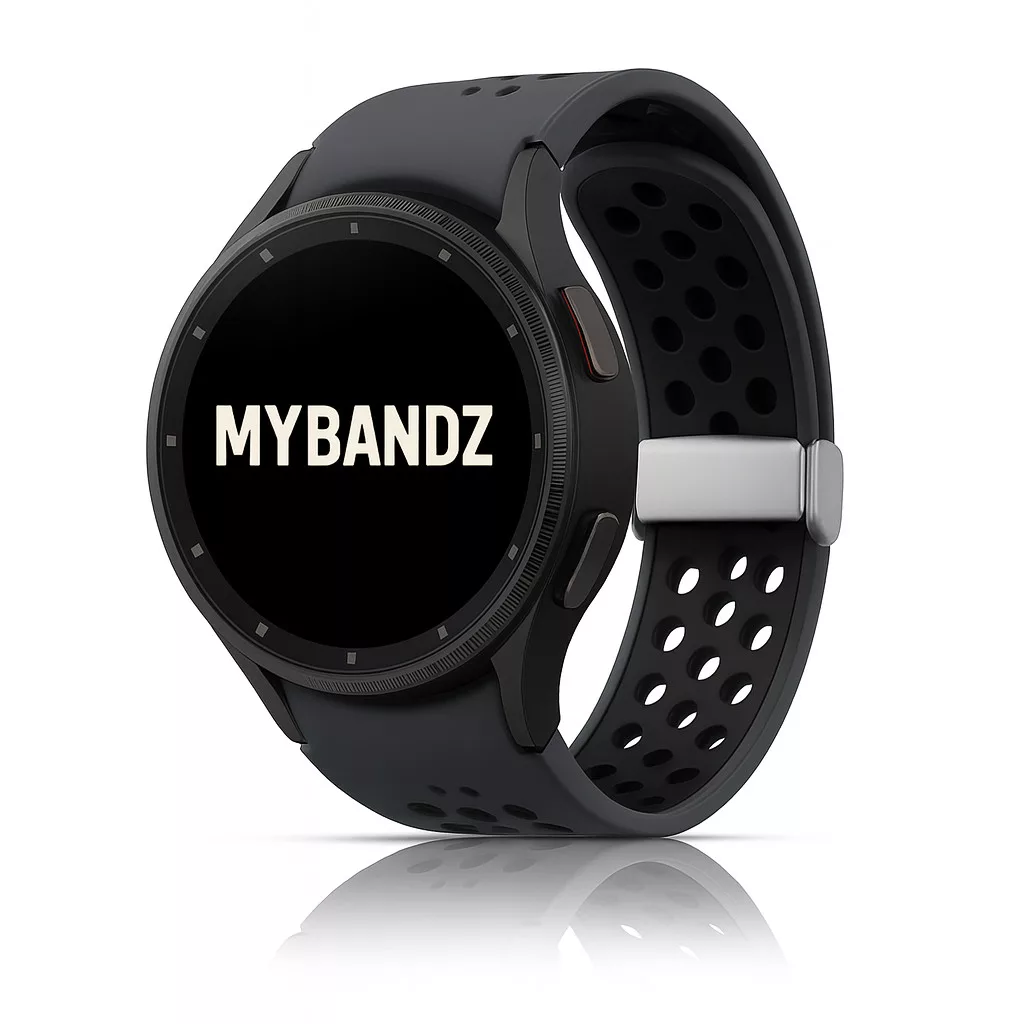 MYBANDZ Lélegző mágneszáras szilikon óraszíj Galaxy Watch 4-5-6-7 /fekete(ezüst csat)